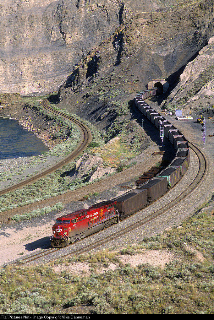 | A westbound Canadian Pacific coal train curves out of the tunnel in Black Canyon west of Ashcroft, British Columbia, on the morning of June 24, 2006. |