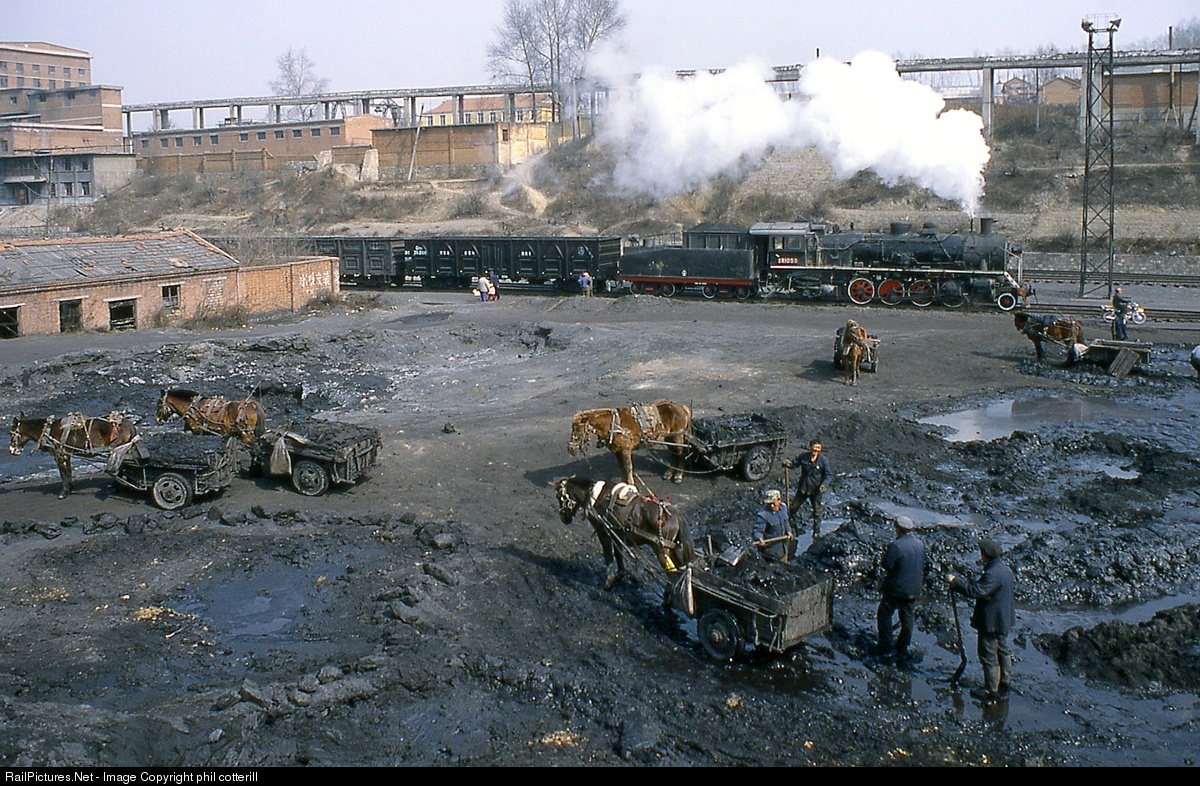 SY 1058 passes by, as several horses have their carts loaded with coal slurry at Chengzihe washery in 2002.