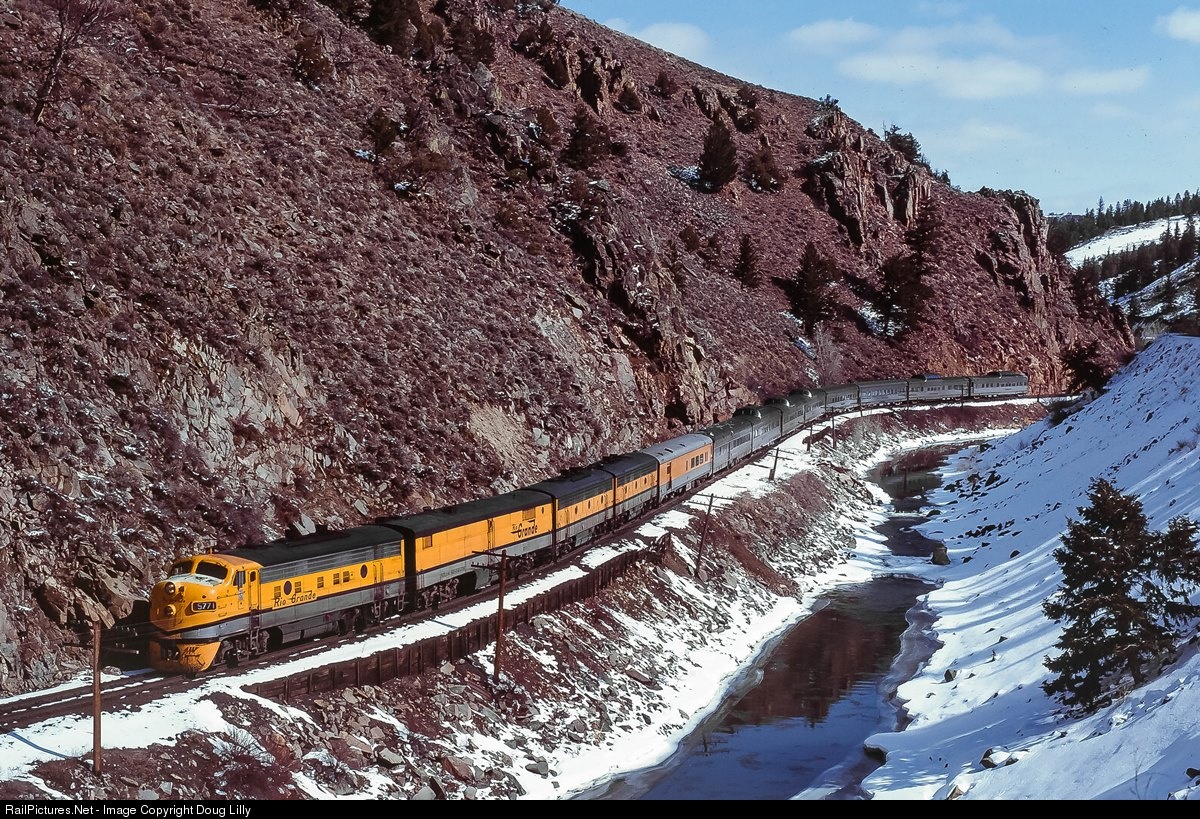 The Rio Grande Zephyr Passed through numerous spectacular canyons in its journey between Denver and Salt Lake City, including Gore, Little Gore, Glenwood, Ruby, and Debeque Canyons. Arguably the most intimate canyon on the Zephyr’s route was Byers Canyon, just west of Hot Sulphur Springs, Colorado. For about two miles, the railroad, the Colorado River, and US Route 40 share the narrow ravine, and the westbound Zephyr’s schedule put it in the canyon at the perfect time of day.