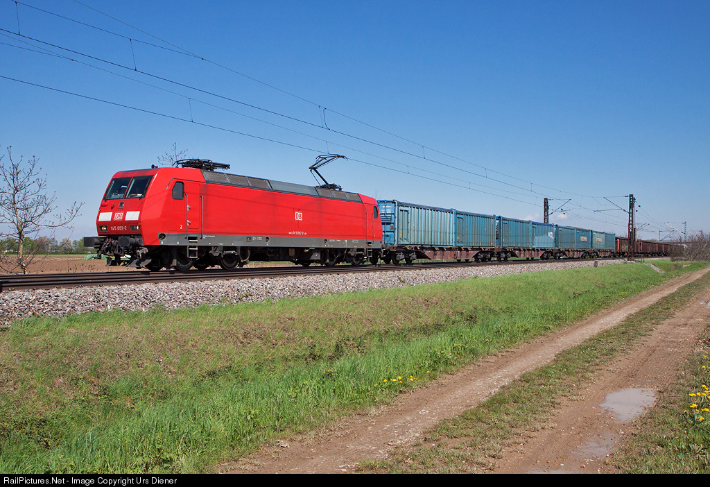 | Locomotive 145 002 of DB Cargo, built 1997 by Adtrans, is leading a southbound freight train. |