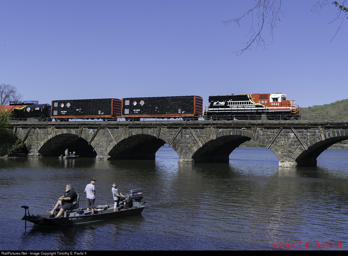 | Norfolk Southern's new OAR trainset pauses for a series of photos on the stone arch bridge at the confluence of Sherman Creek and the Susquehanna River. The trainset was on the move from Altoona to Enola after spending the morning training first responders in the Altoona area. The weather turned to clear skies and it's good to see the local fishermen enjoying the clear weather as much as we were. |