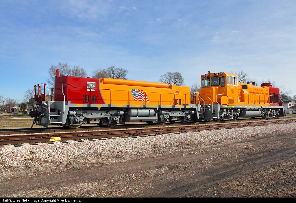 Cedar Rapids & Iowa City slug No. 302, mated to slug mother locomotive No. 202 switches at Cedar Rapids, Iowa, on April 11, 2016. These are new products custom-built by Relco in Albia, Iowa. Slug No. 302 is designated a S4-143 (S=slug, 4=four axles, 143=ballasted weight in tons), while slug mother locomotive No. 202 is designated a L4-1500XD-M (L=locomotive, 4=four axles, 1500=1,500 h.p., XD=extreme duty, M=mother). A new paint scheme on these cutting-edge machines is an interesting combination of deep gold very similar to Rio Grande’s Aspen gold, with Soo Line-like red ends, over a light gray underframe.