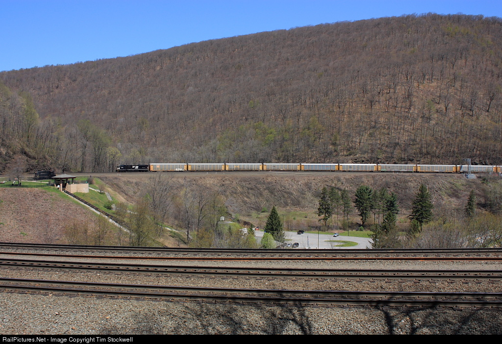Recently rebuilt NS SD70ACU #7320 leads westbound NS Train 11J into Horseshoe Curve, approaching the park. Soon, the train will pass by in the foreground. A recent, collaborative effort between Horse Shoe Curve Park and Norfolk Southern to clear brush and trees has nicely opened-up views at Horseshoe Curve. Regarding the SD70ACU leading the train, this engine was rebuilt from an ex-Union Pacific SD90MAC at Altoona by Norfolk Southern.