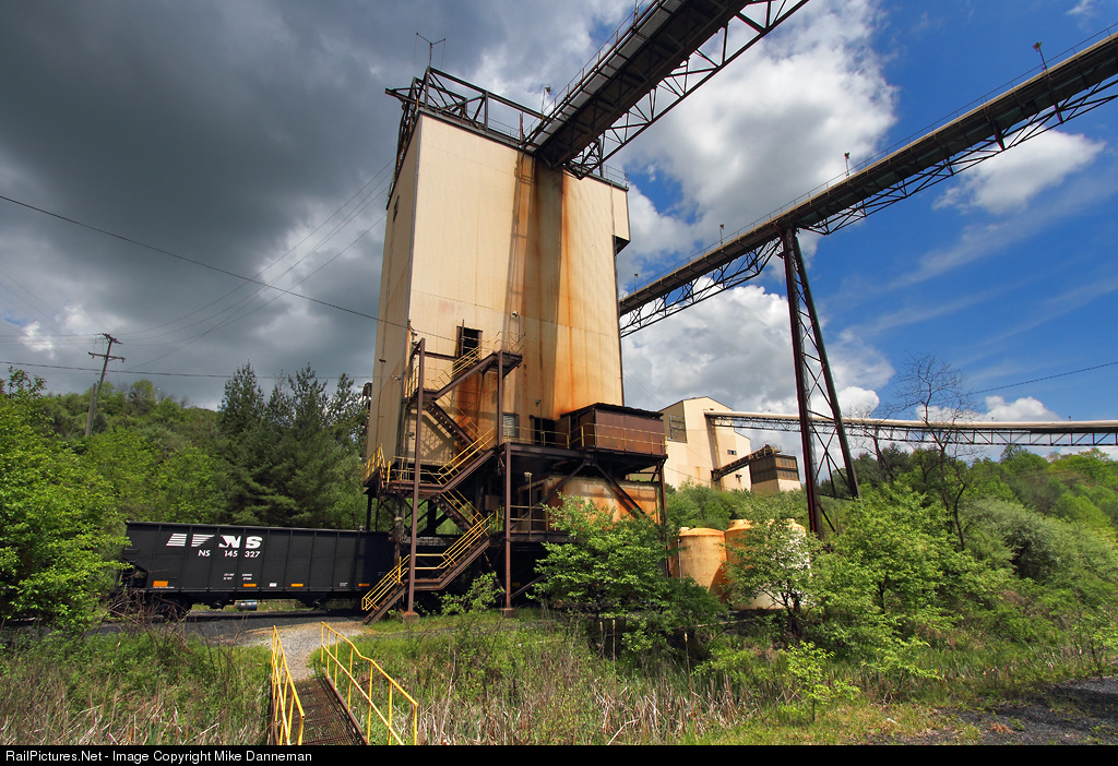 A 60-car unit coal train of higher sulphur coal destined for the Eastman Chemical in Kingsport, Tennessee, loads at Red River Coal Company’s prep plant and loadout at Steer Branch/Dixiana, Virginia, on May 12, 2014. The Norfolk Southern crew fondly referred to this train as “Interstate Railroad U48.”