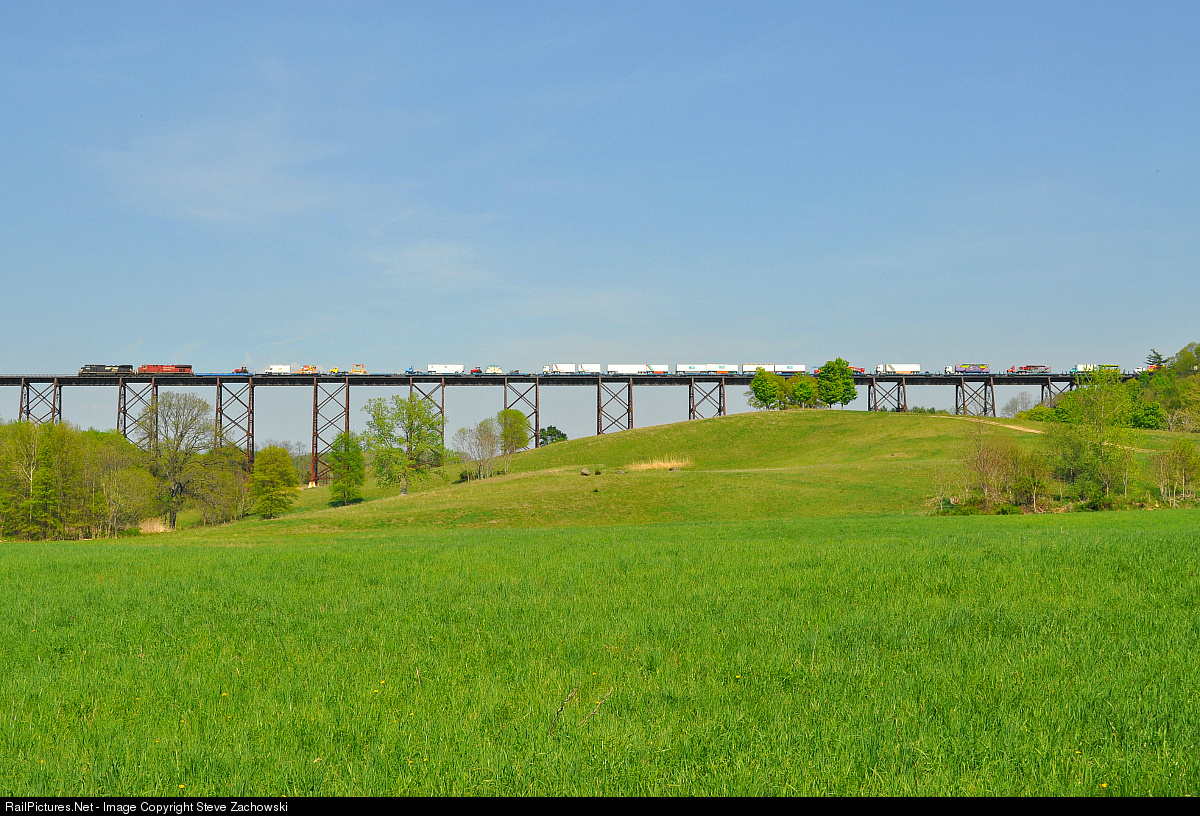 Stretched across the massive Moodna Viaduct, the Strates Carnival train "flies" high above Salisbury Mills as it heads West to Middletown, NY. The annual run of this train is one of the few "road" freights to operate over this impressive structure in daylight. |