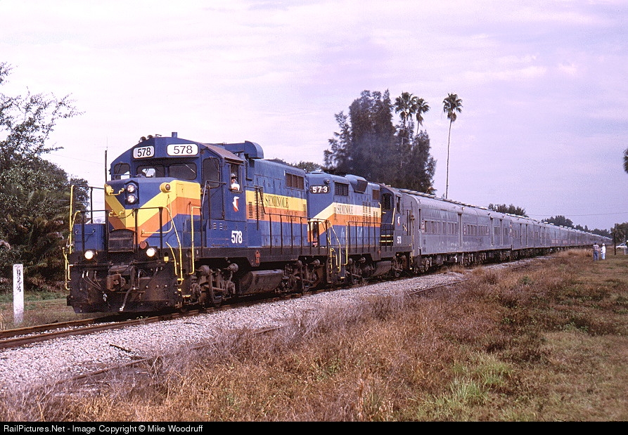 A pair of Seminole Gulf Geeps pull the Ringling Bros. & Barnum and Bailey circus train southbound toward Fort Myers on former ACL trackage. Fuji Sensia 100, Olympus OM-2n, Zuiko 50mm f1.4