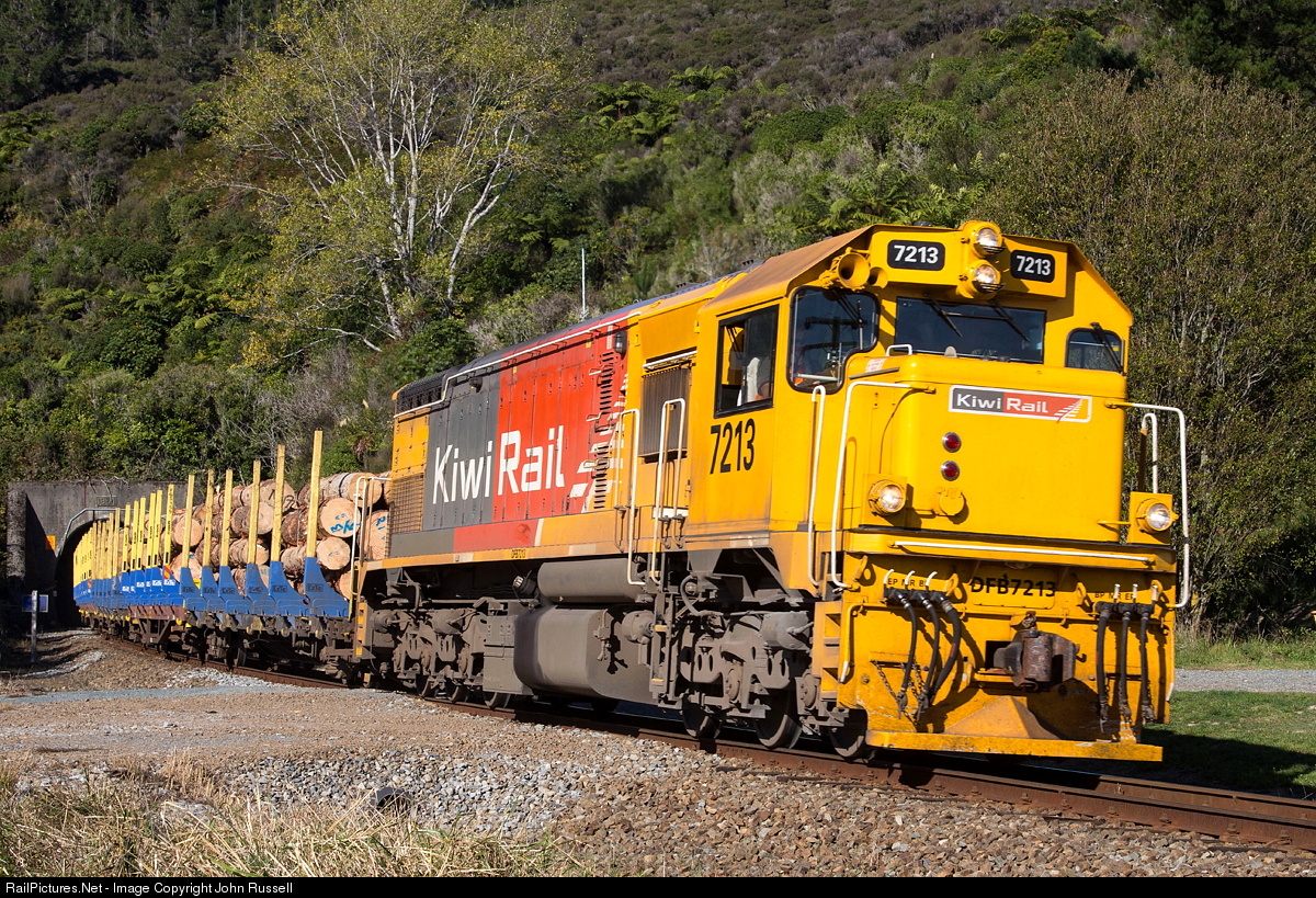 | Train 649 from Waingawa (near Masterton) emerges from the Rimutaka tunnel with another load of logs for shipment from the capital's port. The tunnel is 5.5 miles (8.8Km) long and when opened in 1955 was longest in the southern hemisphere. Prior to 1955 trains used a nearly 8% incline with Fell center rail, special locomotives and brake vans. |