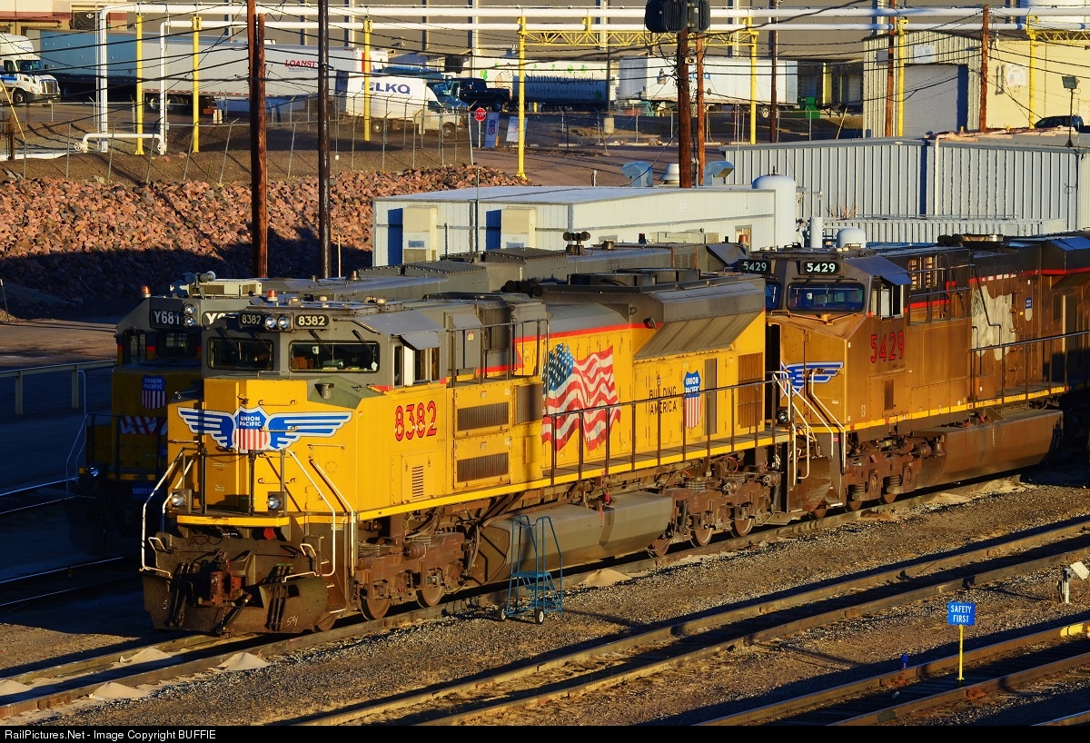 | The early morning sun catches UP 8382 (SD70ACe) in the north yard, paired up with Moffat Tunnel veteran UP 5429 (AC45CCTE). |
