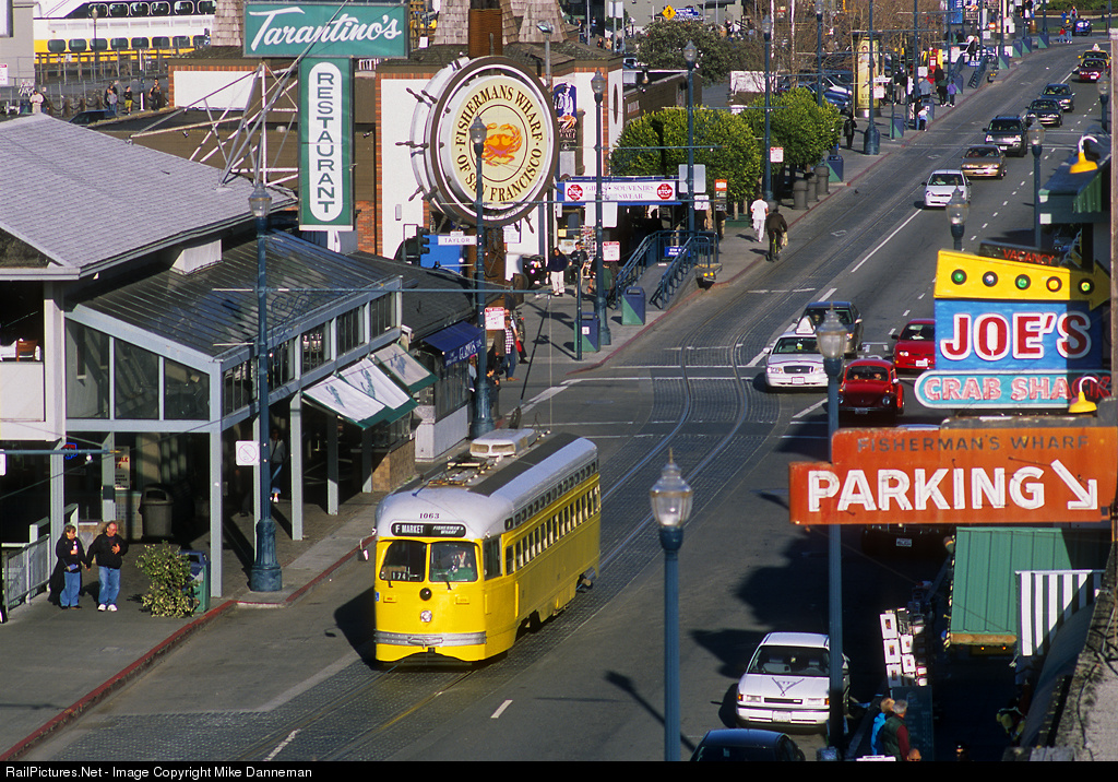 Passing all the local landmarks at Fisherman’s Wharf, a PCC streetcar approaches the Taylor Street stop on Jones Street in San Francisco, California, on the afternoon of March 6, 2003. The yellow and gray (appears white) scheme on car No. 1063 honors Baltimore Transit Company.