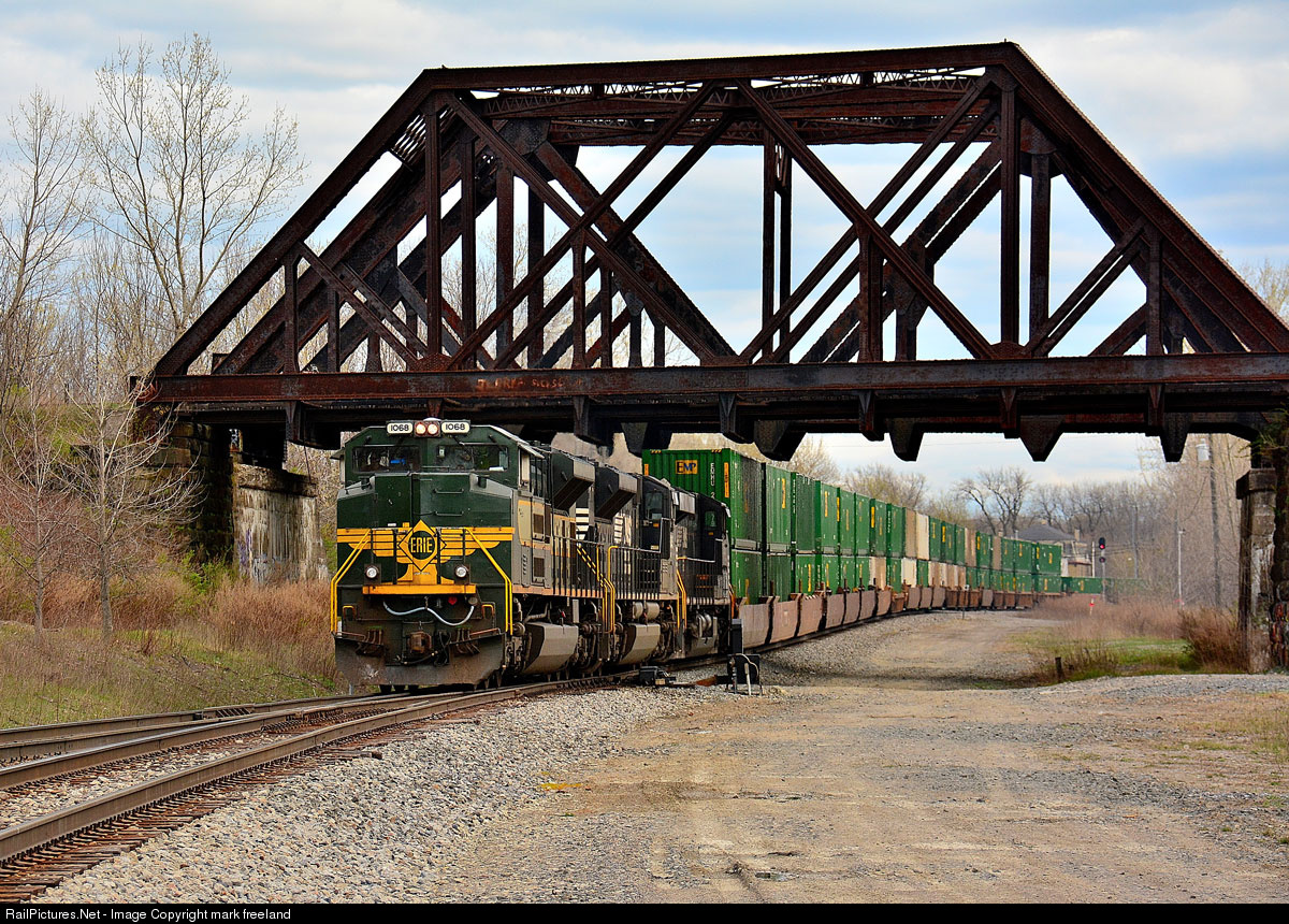 | A 22k with the Erie heritage unit leading past the old New York Central bridge at gb, |
