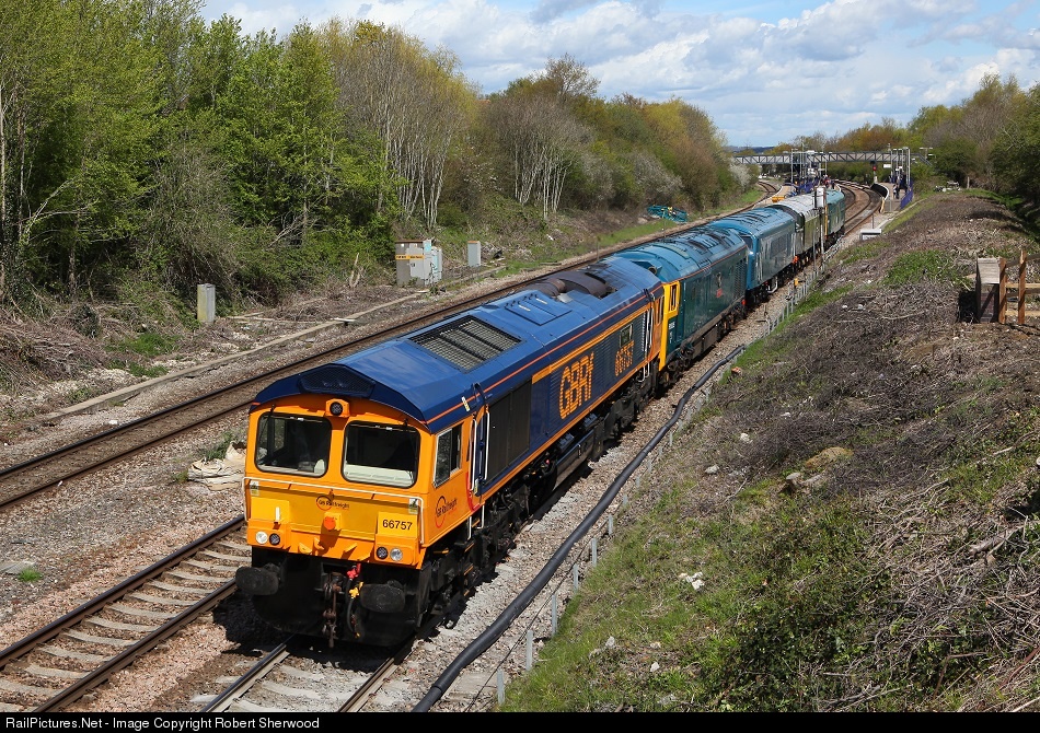 | 66757 hauls 50035, D182, D213 and 5580 through Filton Abbey Wood working 0Z69 10:27 Kidderminster to St Phillips Marsh on Saturday 30th April 2016 |