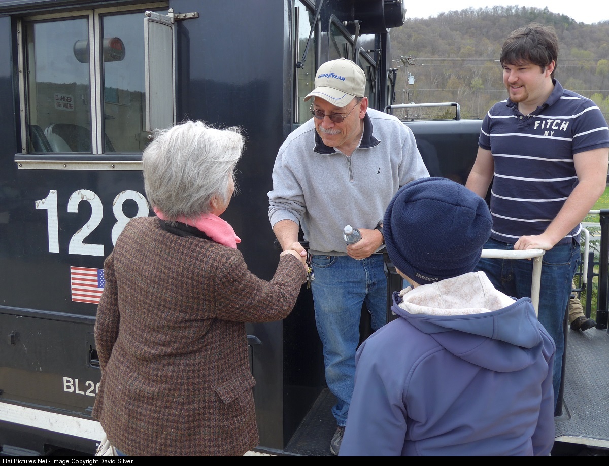| A pair of passengers congratulate engineer Glenn on his last northbound run to Wassaic on his last day of service, after having worked for the railroad for 41 years. |
