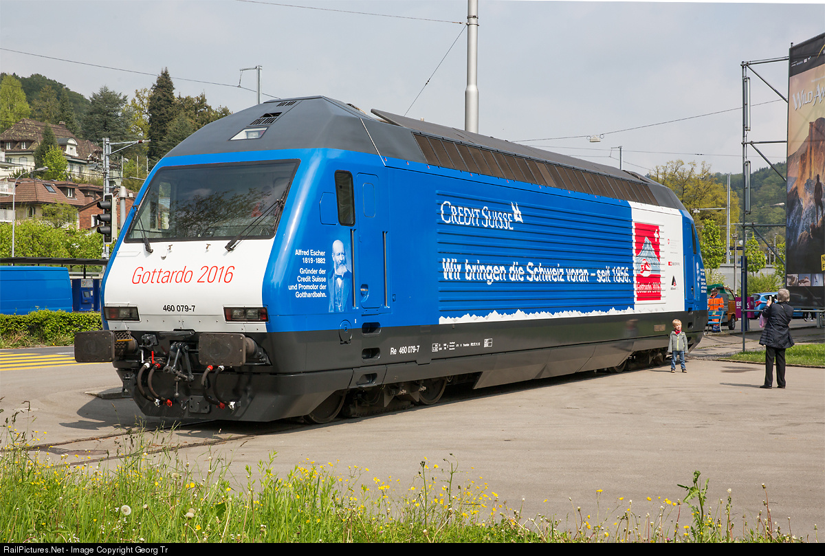 Re 460 # 079 is the newest with publicity paint scheme (adhesives), advertising for the "Crédit Suisse" and Gotthard 2016. The CS bank is one of the main sponsors of the opening ceremonies for the Gotthard Base Tunnel (GBT) in june 2016. A grandmother is taking a picture of her grandchild in front of the "new" locomotive, which is parked near the Swiss Museum of Transport in Lucerne.