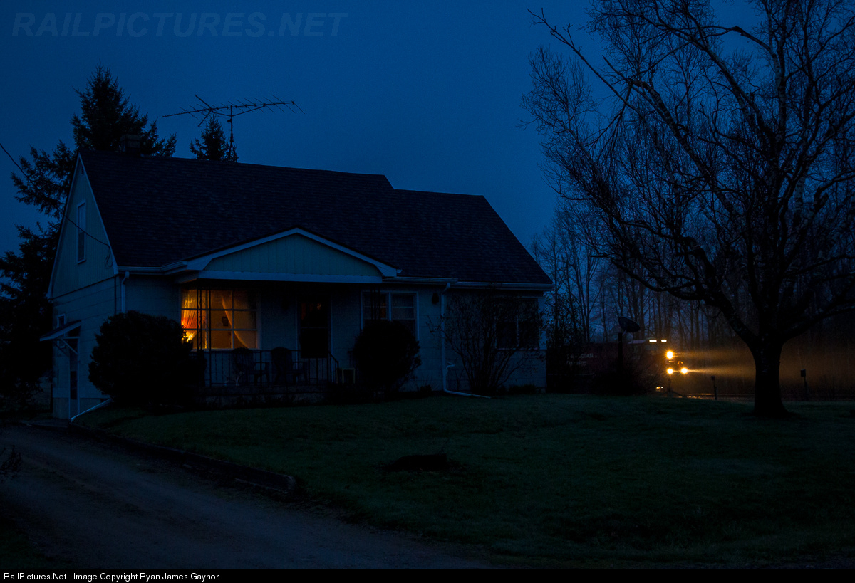 Twenty minutes after sunset, Canadian Pacific's Chicago to Montreal stack train no. 142 is seen passing by a farm house on a gloomy spring evening in Flamborough, Ontario. Having biked to this location from my house (about a quarter mile down the road) I managed to beat the train with less than a minute to spare. This didn't leave me with enough time to set up a tripod but with a frenetic guess at my exposure and steady hands I was able to save the shot.