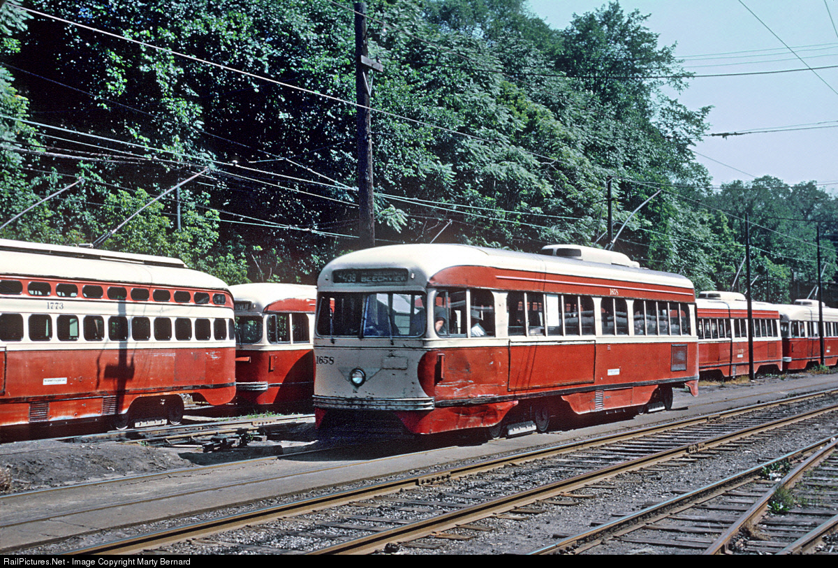 A 42/38 MT. LEBANON - BEECHVIEW (DORMONT) car passing stored 1400 and 1700 PCCs.