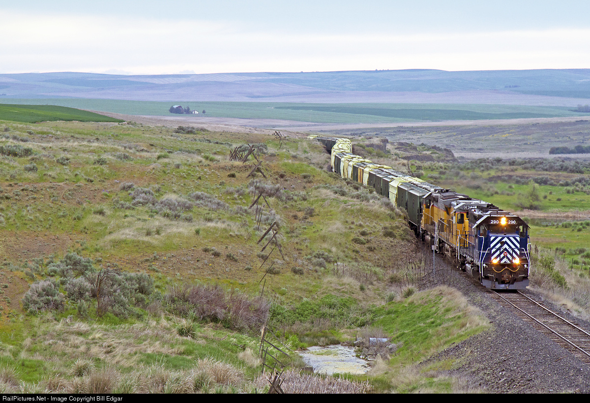 | Eastern Washington Gateway's "scooter" train has picked up at Almira, WA and is following a shallow coulee east through sagebrush and wheat fields to Govan and Wilbur. The train will stop at Wilbur to pick up additional grain loads. |