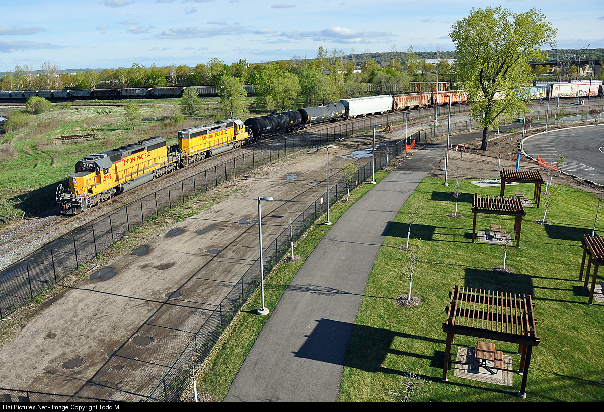 | A UP transfer has to wait for traffic to clear and favorable signals at Division St. before proceeding. The park in the lower right is a "railfan park" constructed on the grounds of St. Paul Union Depot (SPUD) for viewing the train traffic nearby. |