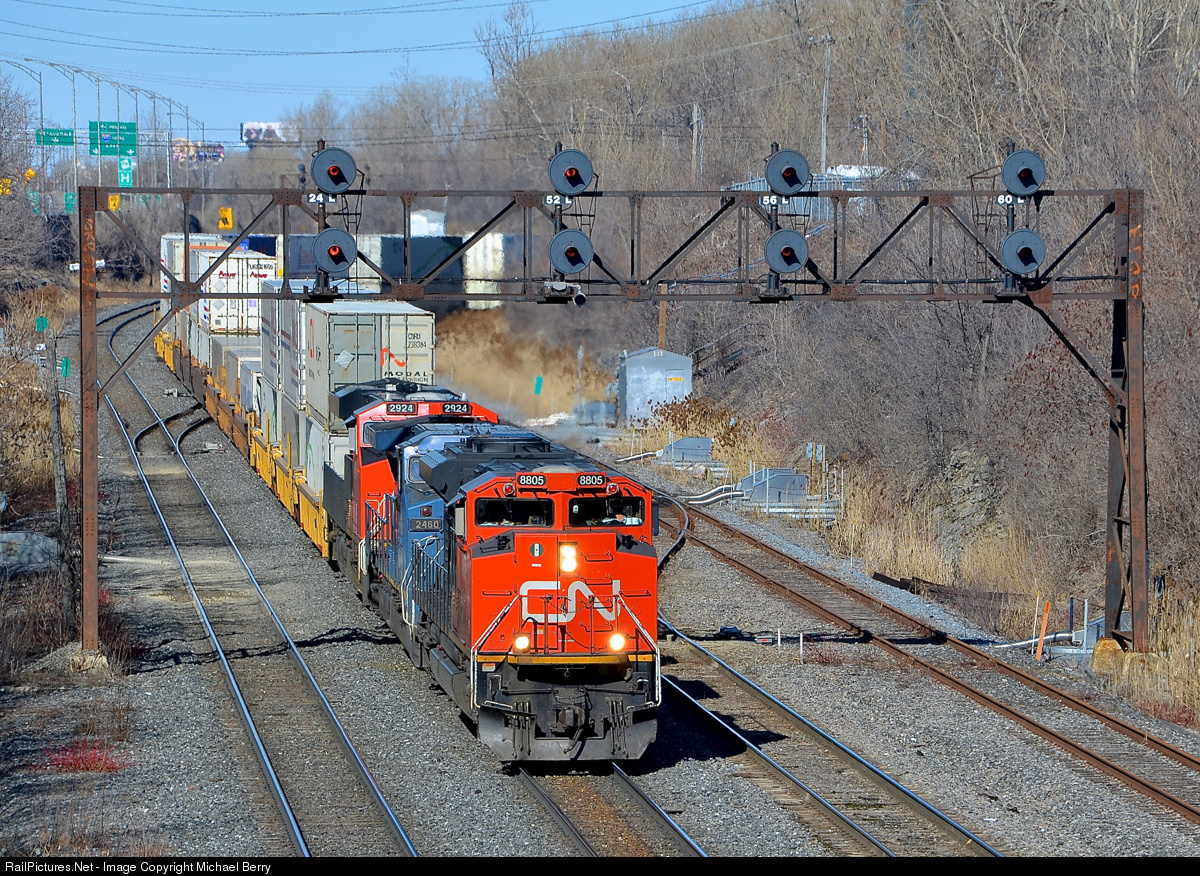 | CN 120 has just left Taschereau Yard in Montreal with its head end power (CN 8805, IC 2460 & CN 2924) arranged elephant style on this long stack train bound for Halifax. Operating mid-train is a fourth unit, CN 8013. |