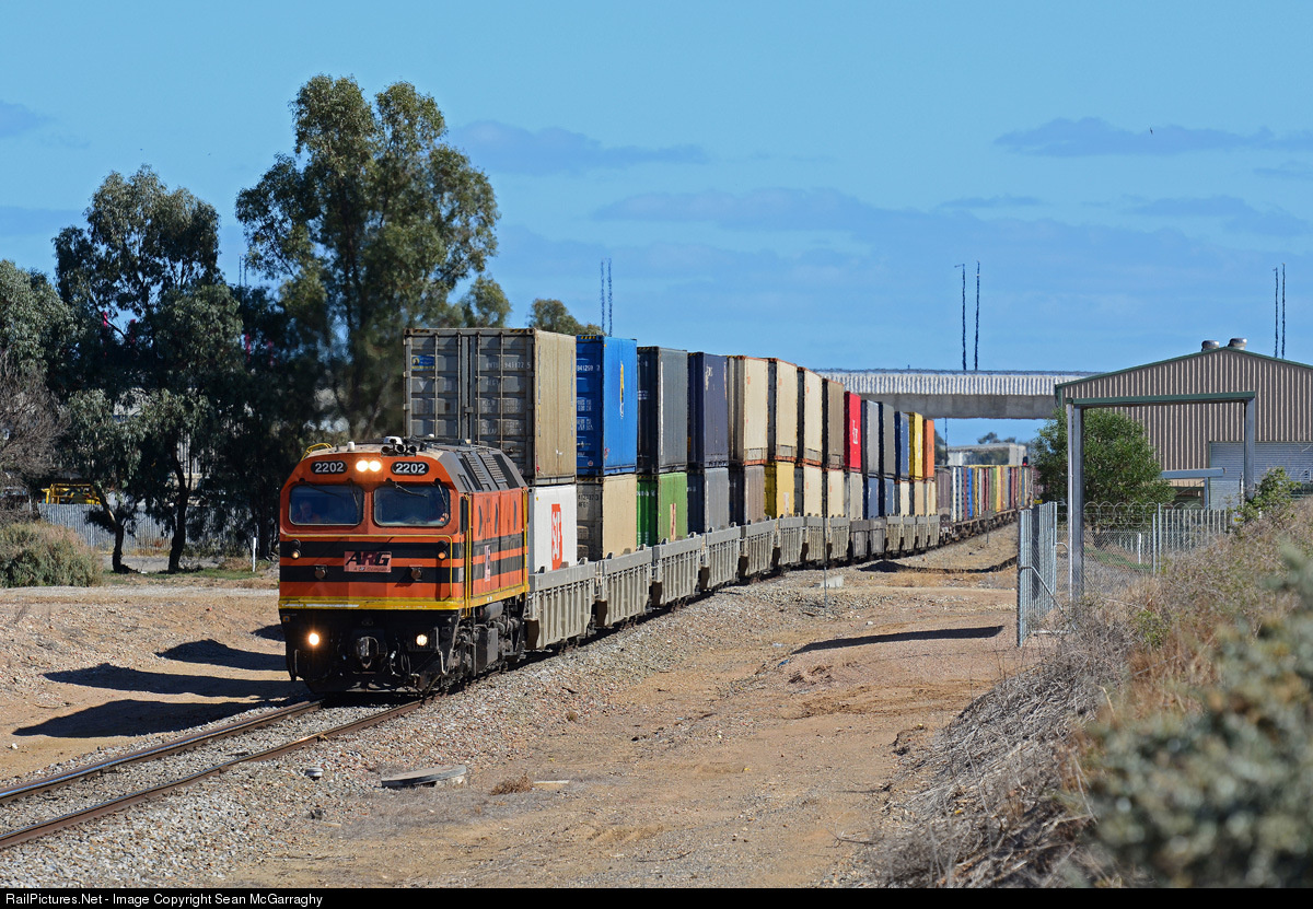 | The 2nd portion of 6MP1 is worked from Port Flat to Dry Creek by 2202 so it can be combined with the first portion that was earlier worked to Dry Creek. 2202 seen approaching the western leg of Dry Creek triangle is only used for the short run from Port Flat before being replaced by bigger power at Dry Creek for the rest of the journey to Perth. |
