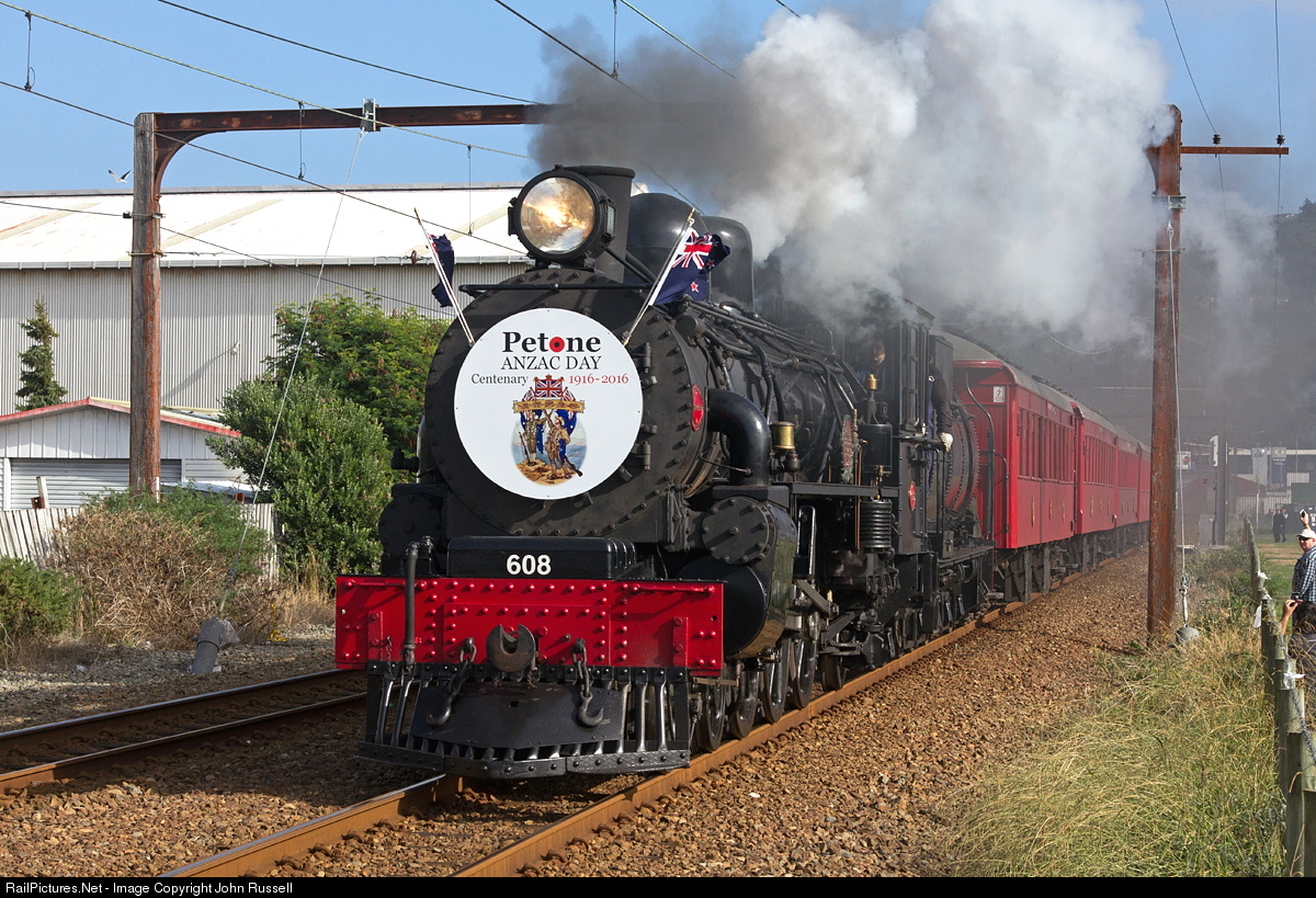 Ab 608 approaches Ava with special from Wellington marking 100 years of ANZAC Day honoring our war veterans. Built in 1915, this locomotive was dedicated as a war memorial honoring the railwaymen who did not return from WW1. It is owned by New Zealand Railway & Locomotive Society. The restoration cost over $500,000, mostly raised by donations.