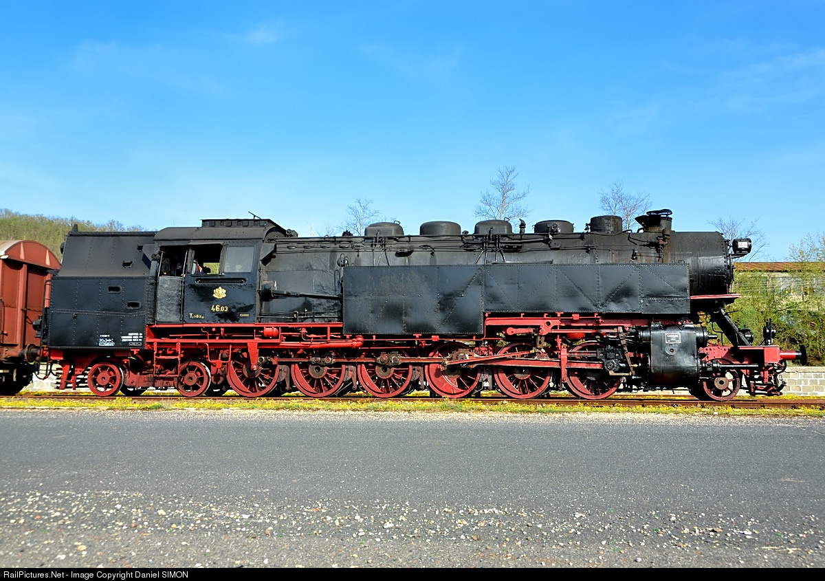 Side portrait of the "Mother Bear" 46 03 resting at the Podkova station. The 46 03 is a standard gauge superheated simple-expansion locomotive. The 3rd and 4th axles have flangeless wheels. The 46 class was designed to haul heavy coal trains on steep mountain gradients which they did very successfully. The locomotives of the 46 class appear to be the most powerful steam locomotives built in Europe. Remarkably, the 46 03 has been preserved and restored to working order. Two batches of the 46 class were built, with some significant differences. The first batch of 12 engines was built in 1931 by Cegielski in Poznan (Poland). These had two cylinders of 700 mm diameter. The second batch of 8 was built by Schwartzkopff in Berlin. These locomotives had three cylinders of 550 mm diameter.