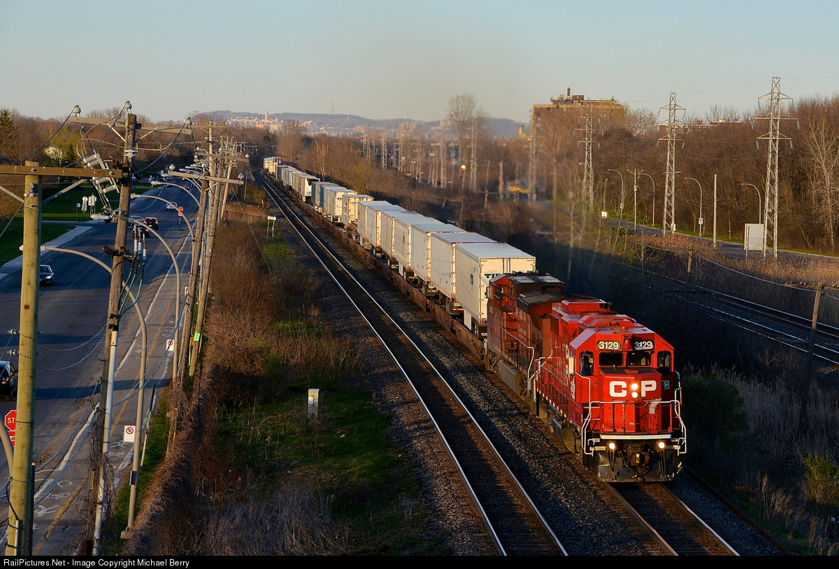 | CP 133 on the south track for once. GP38-2 CP 3129 is leading the westbound Expressway (CP 133) through Pointe-Claire, with AC4400CW CP 8642 trailing. Normally this train operates on the north track, but as CP 142 had just passed on the north track, CP 133 was lined on the south track. |