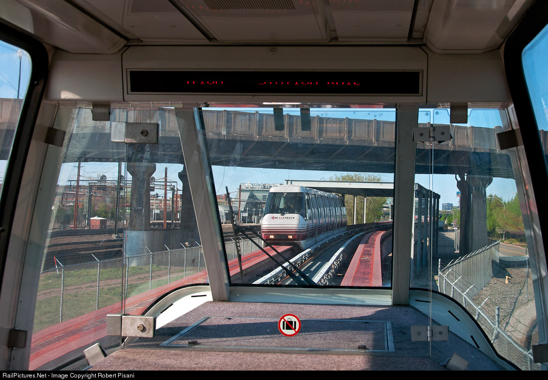 Inbound and outbound AirTrain consists meet just east of the Newark Airport Station. At left, through distortion caused by curved windows, is Amtrak's Northeast Corridor. The overpass carries Haynes Avenue over these very active rail lines. At this location the monorail right-of-way built over land that once contained part of Pennsylvania Railroad's Waverly Yard. There is very little evidence of this yard left today, except for stray catenary poles in the weeds or in parking lots adjacent to the NEC. The Newark Airport Station facilitates connections between NJ Transit, Amtrak and the AirTrain. This monorail connects all terminals and several airport parking lots with the regional rail network. Operation is automated, hence this "engineer's view" from the first car in which I was the only occupant on this beautiful Sunday afternoon.