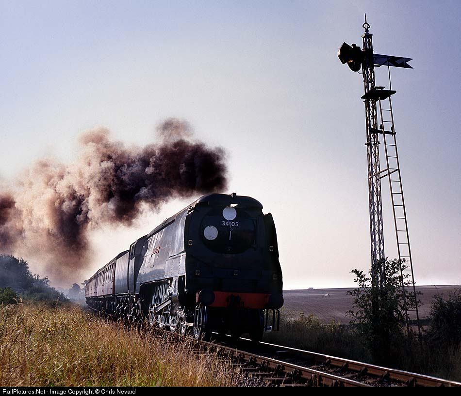 | 34105 catches the low late afternoon light on the bank into Ropley. Late September 1988. Rolleicord VA, Ektachrome 100 |