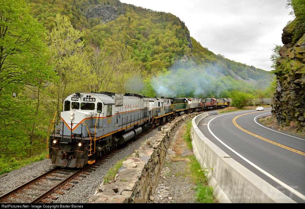 | DL 3643 leads a 6 locomotive mix of Alcos and MLWs through the Delaware Water Gap with a long train, putting on a nice show of smoke and making a wonderful noise as the engineer works to keep the train moving through the Poconos. |