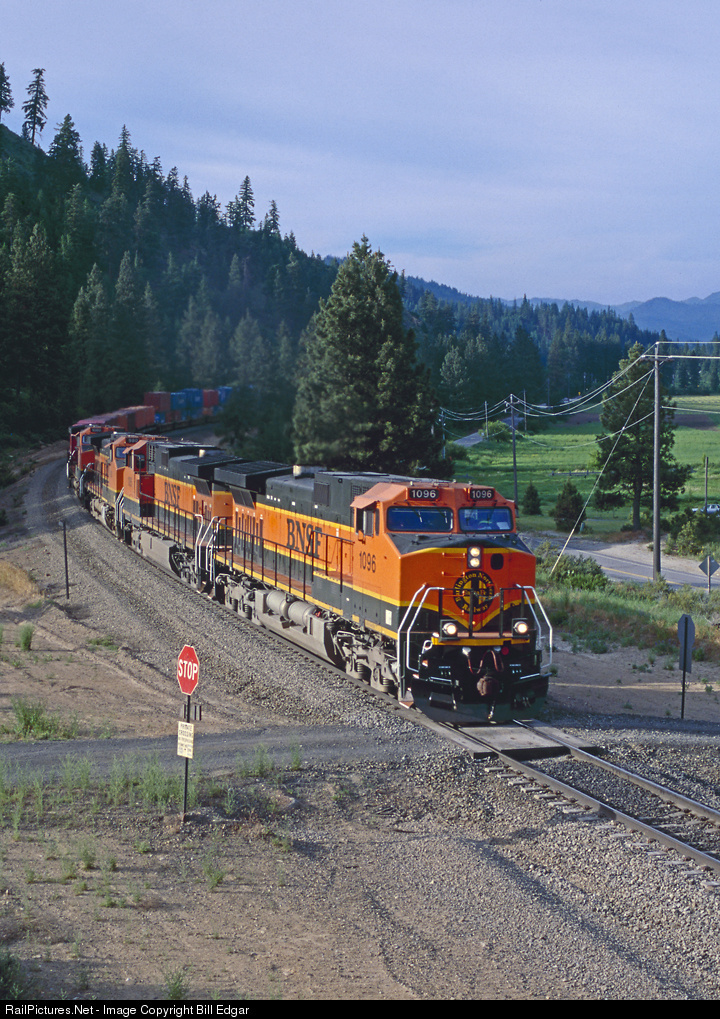 | BNSF 1096 leads a quartet of Heritage I GEs west on a stack train headed to Seattle. The train has been climbing the Chumstick sutoff west of Leavenworth, WA and is about to duck into the Chumstick tunnel, the first of three tunnels that will get the train back over to Winton and the banks of Nason Creek for the final climb up to the Cascade tunnel. 1997 was the summer of Heritage I in the Cascades. |