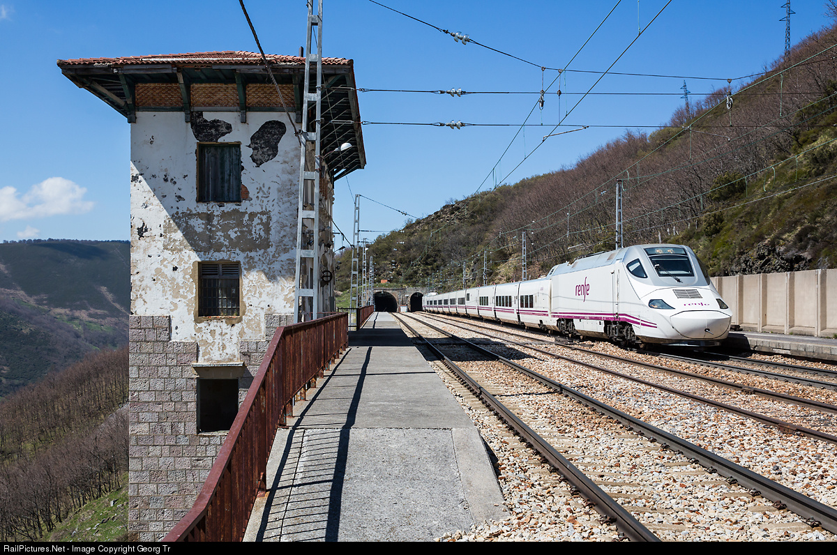 | Variable gauge train Talgo 130 # 033 "Patito" running as Alvia 4140 from Gijón to Castello de la Plana via Madrid through Pajares station on the north ramp of the pass. The station isn't manned anymore, no passenger train stops here. The village lies several hundred meters deeper. |