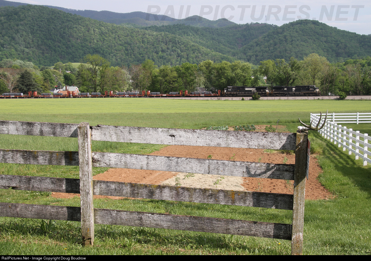 | Western Virginia is a very scenic place and the small town of Shawsville is no exception. The Norfolk Southern (former Norfolk & Western) Christiansburg district runs through the center of town and passes the open farm land that defines the area. Standing in the driveway of many of the farms one can witness up to 40 trains a day on the mainline. Seen here a NS mixed freight heads West from Roanoke and charges up the grade. |