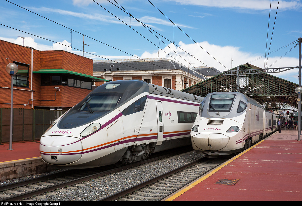 Avant 8158 service is leaving Valladolid-Campo Grande for Madrid-Chamartin, run by highspeed train 114 # 005. The 13 standard gauge trains of the 114 series were built by Alstom and CAF in 2009, have a max. velocity of 250 km/h and 4000 kW below 25000 V 50 Hz AC. They are similar to the ETR 600/610 series of Trenitalia/SBB, but not tilting. On the right is a 130 series Talgo "Patito", just arrived from Alicante and going to Santander as Alvia 4143.