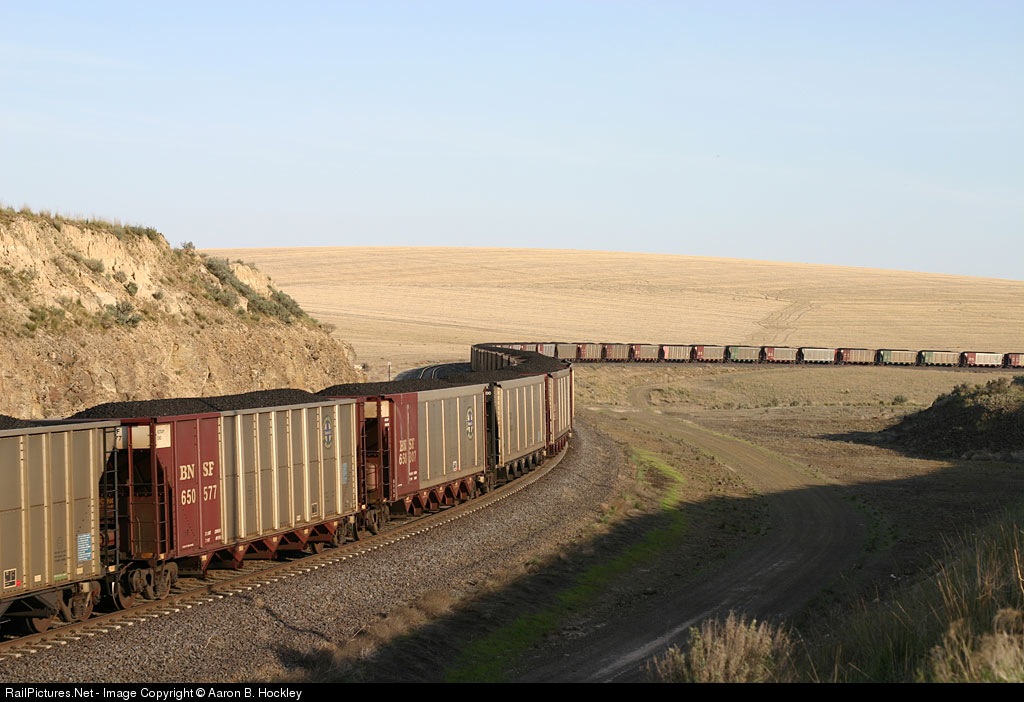 A set of BNSF coal cars snakes across Providence Hill