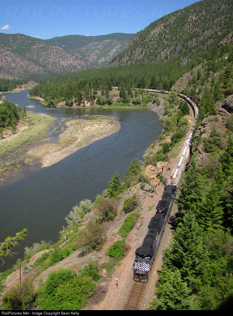 | From a vantage point on the rocks high above Plateau Tunnel, one of MRL's sporadically-ran unit talc trains races down the Clark Fork River through some spectacular canyon scenery on its journey west towards Longview, WA. |