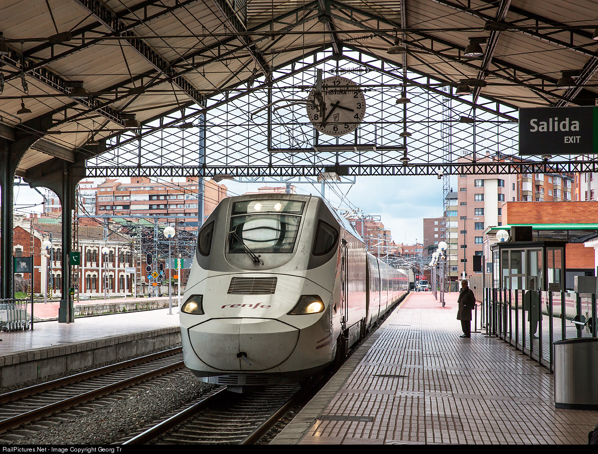 | Alvia service 4141 with a variabel gauge Talgo of the 130 series is entering Valladolid-Campo Grande from Madrid Chamartin. Running on standard gauge now, the train will change to the iberian broad gauge of 1668 millimeter south of León to run over the Pajares pass to Oviedo and Gijón.