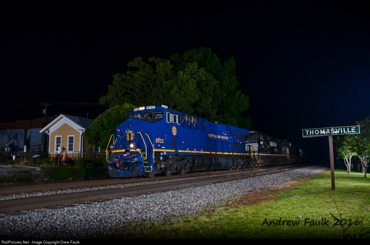 | Selma to Linwood manifest 349 makes an appearance in Thomasville, NC with the Norfolk and Western Heritage ES44AC leading the way just before midnight on May 11, 2016. |