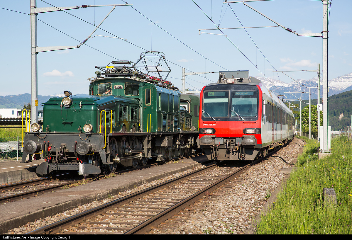"Crocodile" Be 6/8 III # 13302 of SBB History, operated by "Betriebsgruppe 13302" in Rapperswil, is passed by a regional train with railcar RBDe 560 "Domino" in Bollingen.
