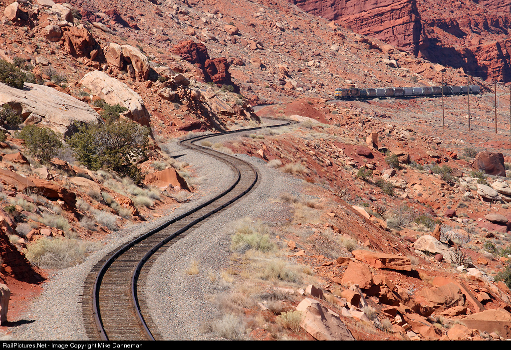 A 13-car Potash local approaches multiple curves nearing Emkay, Utah, on March 4, 2012. This is a former Rio Grande branch, now Union Pacific’s Cane Creek Subdivision running through red rock country skirting Arches National Park.
