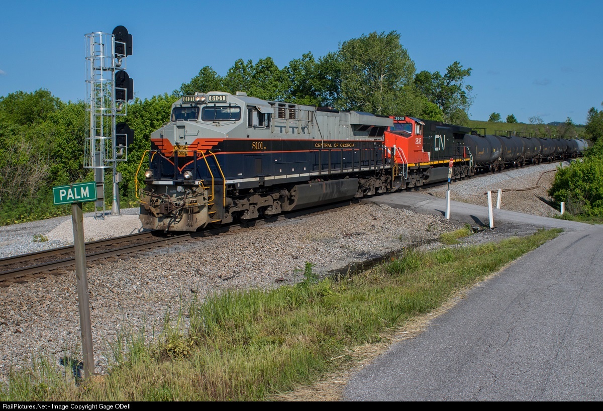 NS M11, with the Central of Georgia heritage unit leading, passes by an original Southern station sign at Palm as it races into the morning sun toward Burnside