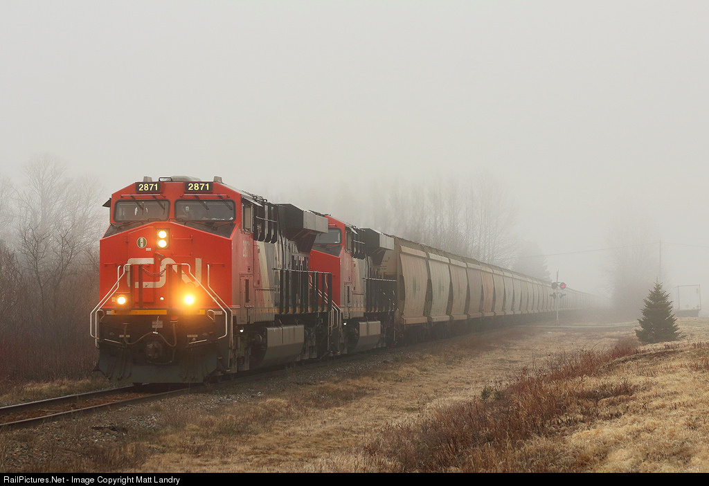 | CN 2871 leads a loaded Canpotex potash train, as it passes through the foggy town of Apohaqui, New Brunswick. |