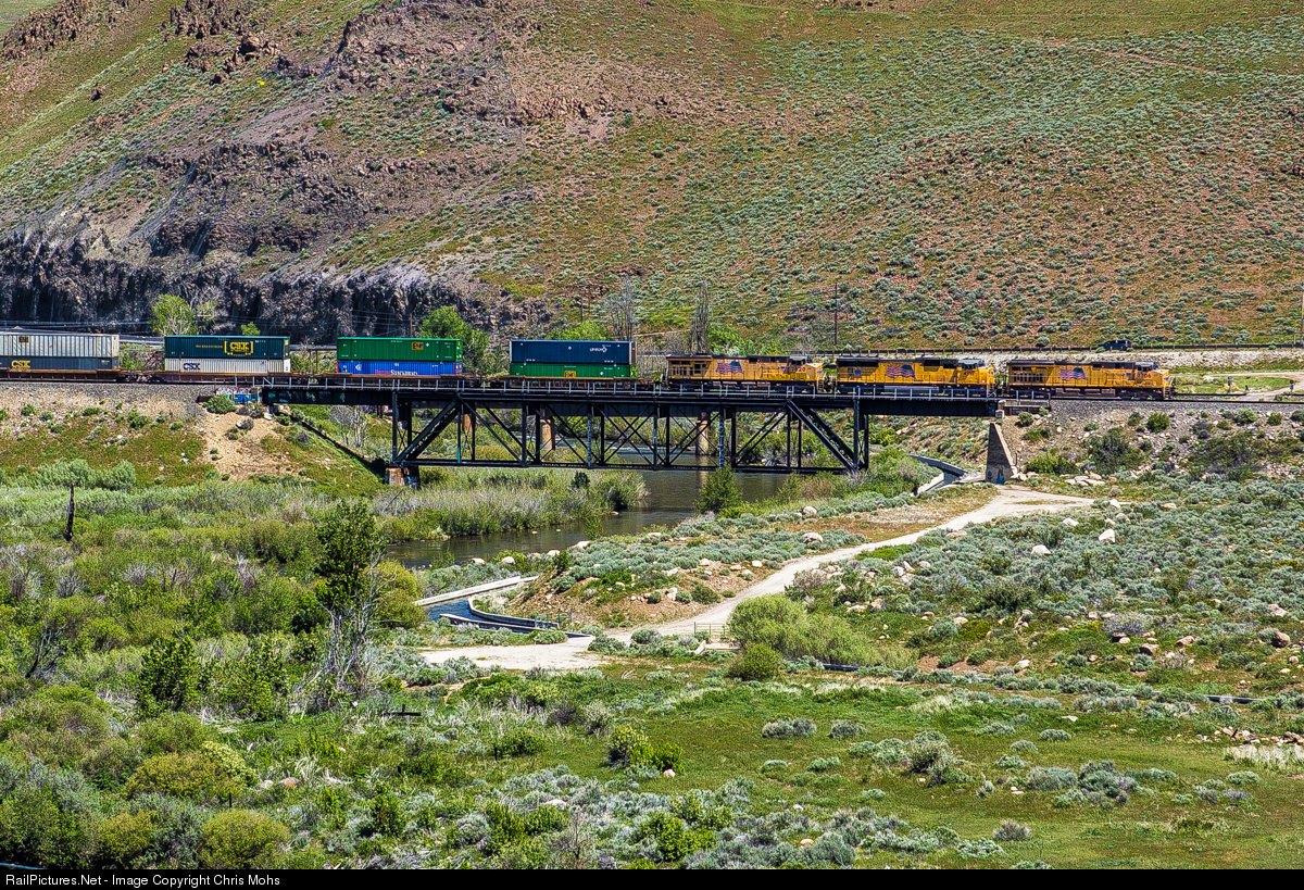 A Union Pacific Double Stack rolls eastbound over the Truckee River at Verdi Nevada.