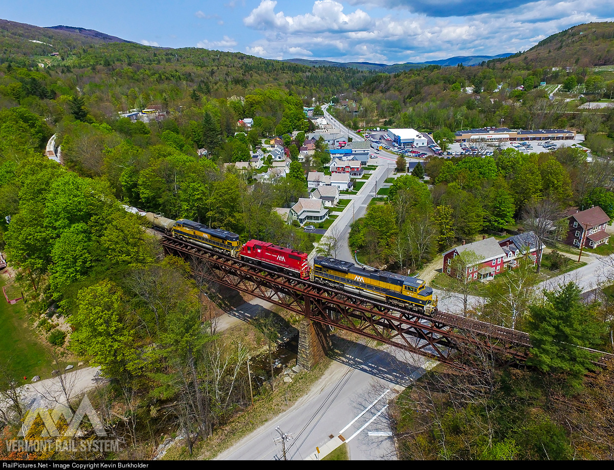 Vermont Railway's first road unit and latest road unit acquisitions teamed up to move 41 cars - 36 loads, 5 empties - over the summit of the Green Mountains on the GMRC Bellows Falls Subdivision on Friday, May 20. VTR's ex-FEC SD70M-2s, VTR 432 and 431, bookend VTR GP38-2 201 roll high above the town of Ludlow, Vermont.