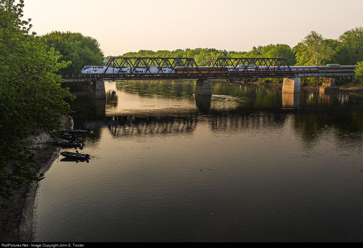 Amtrak locomotive 148 leads Kentucky Derby P933 passenger special north to Chicago during the morning of 05/08/16. The train is crossing the Wabash River north of Lafayette, IN.