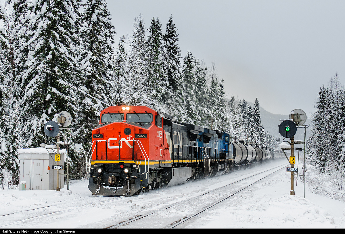 Repainted into CN colours, IC C40-8W 2465 splits the intermediate signals at Mile 13.8 of the Albreda Sub on the point of train M309.