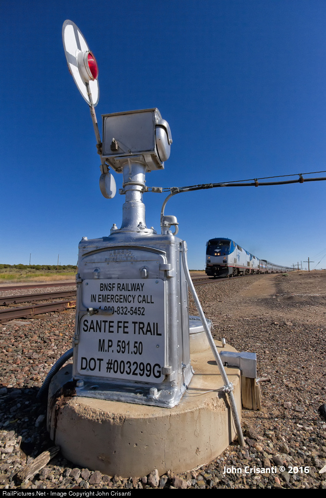 Located 36 miles southwest of La Junta, Colorado along US-HWY 350 and BNSF's Raton Subdivision is the last remaining active Wig-Wag crossing on any Class I railroad. Seen here, running on time, AMTK P42DC No. 24 leads the westbound Southwest Chief through Delhi on a sunny morning on May 21, 2016.