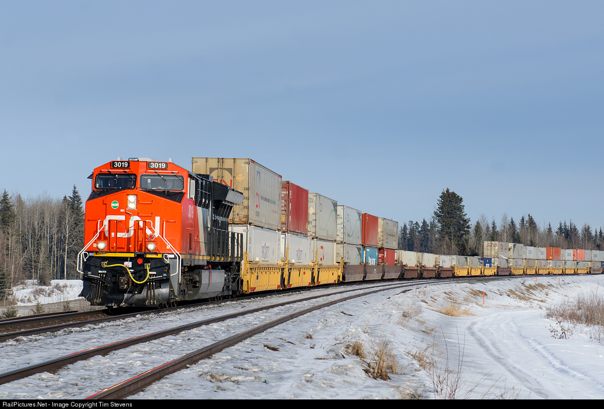 | CN ET44AC 3019, a recent addition to the CN motive power roster, heads into Edson with train Q119. |