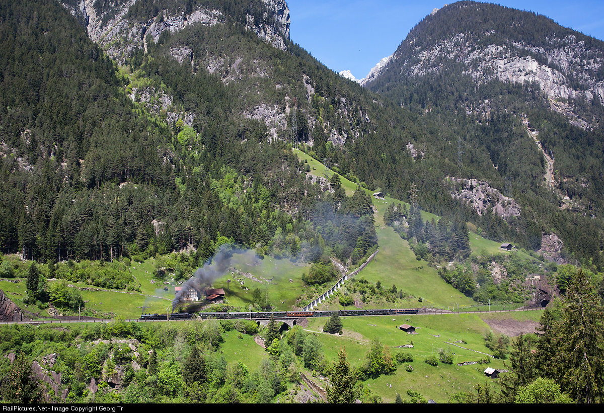 A 8 car steamtrain with 358 metric tons is pulled over the 2.6 % grade of the Gotthard north ramp by A 3/5 # 705 (4-6-0, SLM 1904) and C 5/6 # 2978 (2-10-0, SLM 1917). The train left Muhren tunnel shortly and crossed the Häggrigerbach bridge between Gurtnellen and Pfaffensprung. Above the train you see a concrete avalanche guide wall.