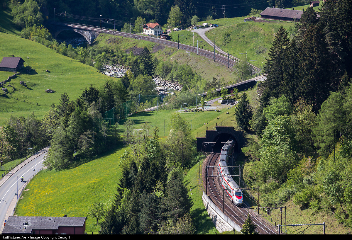 Highspeed tilting train ETR 610 of Trenitalia is running southbound on the Gotthard north ramp at Wassen. Actually, the train is heading north on the middle level of the loops. The section in the background is the Wattinger curve on the lowest level, which was passed by Eurocity 153 from right to left, about 100 seconds before this shot. Two minutes later, you can see the train on the uppermost level, see picture http://www.railpictures.net/viewphoto.php?id=577297