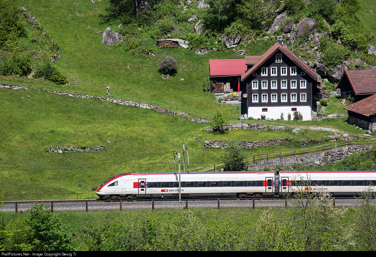 | Intercity tilting train (ICN) RABDe 500 # 015 "Jean-Jaques Rousseau" is running as ICN 870 from Lugano to Zürich, passing the very small hamlet of Hägrigen, 827 meter a.s.l, on the north ramp of the Gotthard mountain line between Wassen and Gurtnellen. |